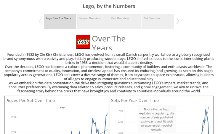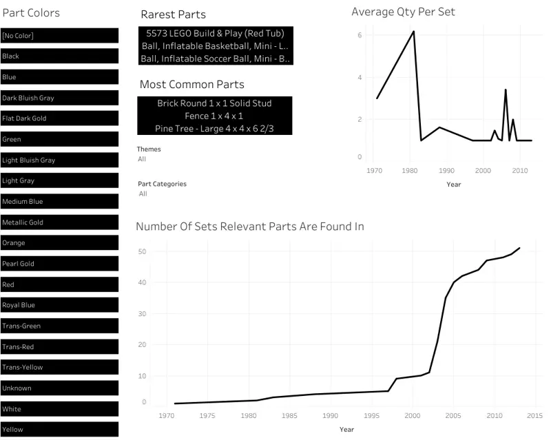 Description: This dashboard gives general metrics to allow users to visualize Lego's historical development in complexity and style, and then cycle through individual breakdowns by part or set to analyze components and trends for specific points of interest.