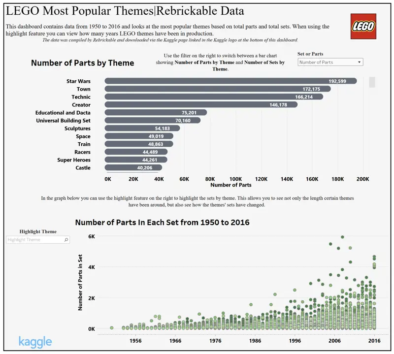 Description: Since the 1950's LEGO has created thousands of different LEGO sets all of which are assigned to a specific theme. Some themes are based on movies like Star Wars, while others are based on cities or cars. A simple question to ask is, which LEGO theme is most popular? The answer, however, is not as simple. In my dashboard you can decide which theme you believe is most popular by looking at three different metrics: number of sets for each theme, number of parts for each theme, and length the theme has been around.
