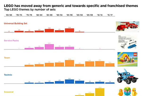 Description: These are the top LEGO themes by the number of sets developed for each theme over time. This data visualization shows that LEGO has moved away from generic themes such as "Universal Building Sets" and "Town" and towards specific and franchised themes, like "Star Wars" and collectible minifigures of popular characters like Elsa from Frozen.