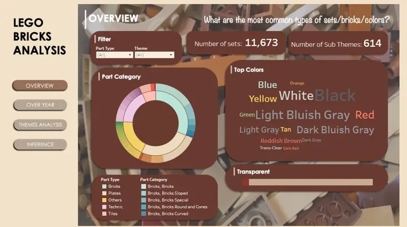 Description: This data visualization analyzes Lego Brick Data from 1950s to 2010s to address 4 big questions: Most Common Types (Overview), Evolution over Time (Over Year), Theme Overlaps and Differences (Themes Analysis), Inference about Target Audience (Inference)