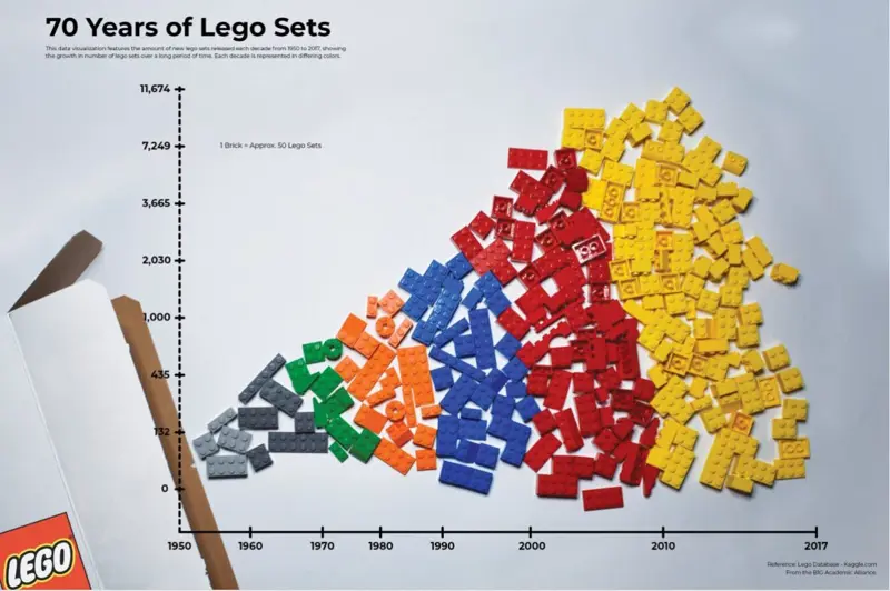Description: This data visualization features the amount of new Lego sets released each decade from 1950 to 2017, showing the growth in number of Lego sets over a long period of time. Each decade is represented in differing colors.