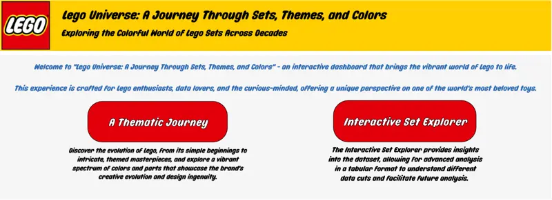 Description: Lego Universe: A Journey Through Sets, Themes, and Colors. Explore the colorful world of Lego sets across decades in an interactive dashboard that brings the vibrant world of Lego to life. This experience is crafted for Lego enthusiasts, data lovers, and the curious-minded, offering a unique perspective on one of the world's most beloved toys.