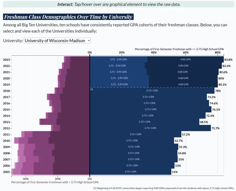 Specifically, this work primarily focused on the percentage of students in each freshman class that have a high school GPA of at least 3.75. Nerd out with the data with several interactive visualizations that let you do a deep dive into the high school GPAs of the incoming freshman classes across the Big Ten over the past 20 years!