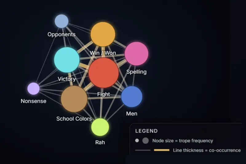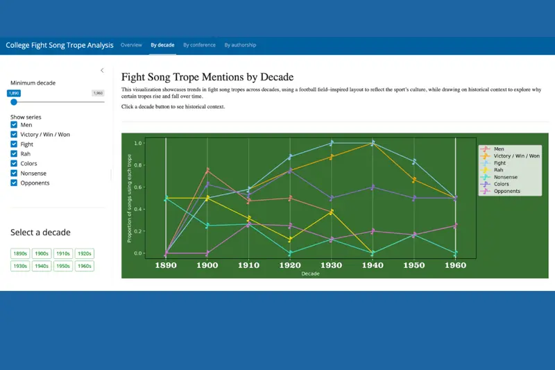 College fight songs are a unique intersection of music, athletics, and institutional identity. This project examines how common lyrical tropes, such as references to victory, opponents, school colors, and collective identity, have evolved across decades, by athletic conference, and by authorship.