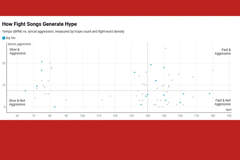 Our project explores how college fight songs generate crowd energy by examining the relationship between musical tempo (BPM) and a composite measure of lyrical aggression derived from song lyrics. We used a two-dimensional framework to highlight distinct stylistic approaches to 'hype' and extend the analysis by examining how these styles appear across different Big Ten home-stadium environments.