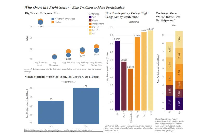 Who Are Fight Songs Really For? College fight songs are often treated as harmless rituals, but they are cultural artifacts. They encode who is being addressed, who is expected to sing, and whose voice is preserved. Some songs invite anyone in the stands through chants, spelling, and nonsense syllables. Others reflect elite tradition: formally written, historically fixed, and lyrically narrow. This project asks whether fight songs are designed for mass participation or elite tradition, especially within the Big Ten. We built a Participation Index from four crowd-oriented features: nonsense syllables, “rah” chants, spelling, and student authorship. Each song scores from 0 to 4, where higher values signal immediacy and crowd ownership. Using dot comparisons, bar charts, and stacked bars, the visuals compare the Big Ten to other conferences, student-written to institution-written songs, and inclusive versus exclusive language. Together, they reveal a tension at the heart of tradition: spirit can be powerful while still being selective about who it speaks for.