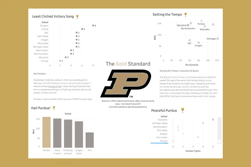 This visualization presents a playful yet analytical comparison of Big Ten university victory songs to highlight what makes Purdue distinctive. Through interactive elements, it groups schools based on characteristics such as lyrical clichés, musical tempo, tone, and thematic content. Instead of focusing on raw numbers, the dashboard uses these qualitative dimensions to tell a story: Purdue consistently rises to the top because its fight song is more original, faster‑paced, and more positive than its peers. The design blends data with narrative to show how Purdue’s musical traditions symbolically reflect its innovation, values, and culture.