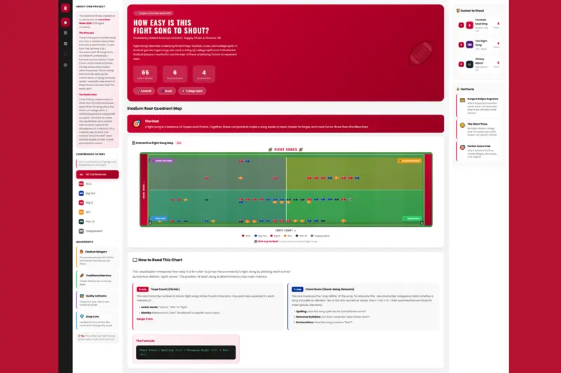 The primary goal of a fight song is to turn a crowd of spectators into active participants. This visualization measures how easy it is for a fan to jump into a university's fight song by plotting each school across four distinct "spirit zones."