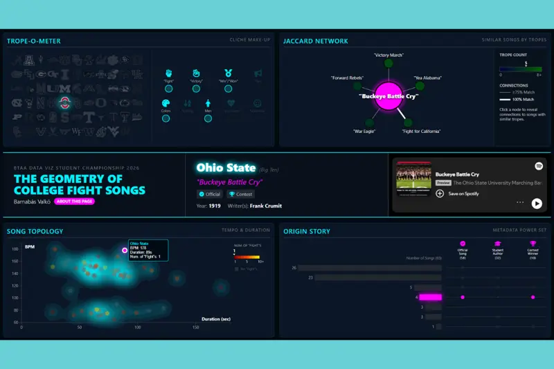 For the 2026, students were provided with a College Fight Songs dataset and tasked with creating visualizations that bring this musical tradition to life.